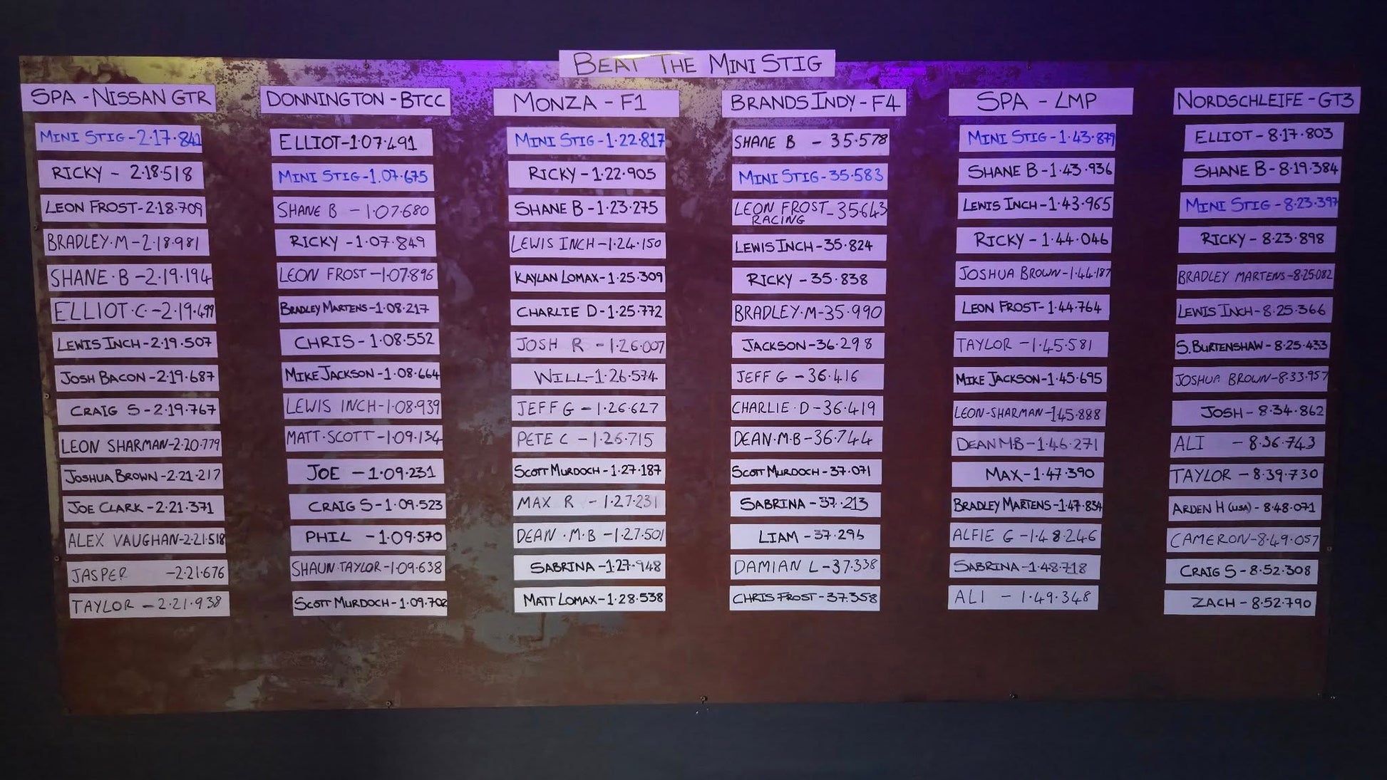 We also have our leader-board wall in venue (Think old school top gear) where the top 15 laptimes from each mini stig challenge are displayed for all to see.